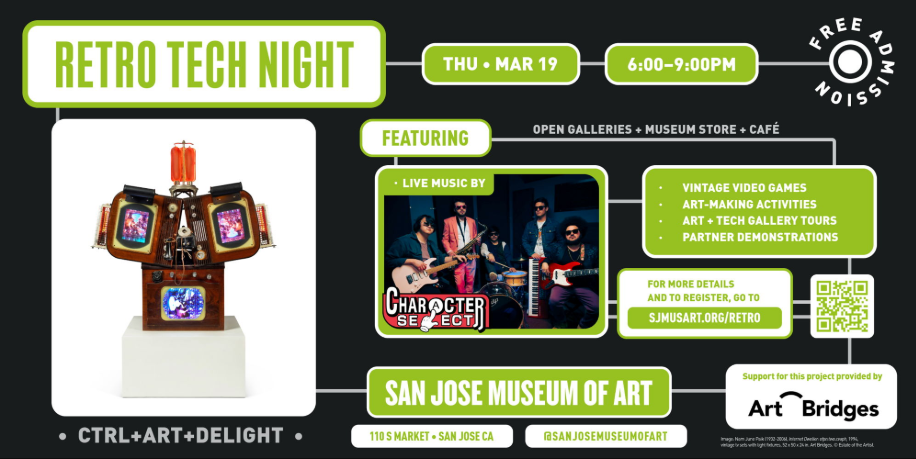 Disrupt your evening programming with Retro Tech Night: Ctrl+Art+Delight at SJMA. Join us for an evening to reset and refresh, featuring hands-on artmaking activities, live music by Character Select, vintage video games, partner demonstrations, and art & technology-themed tours of the Museum's collection galleries. Collaborators Organizations: Bay Area Glass Institute; California Room, San José Public […]