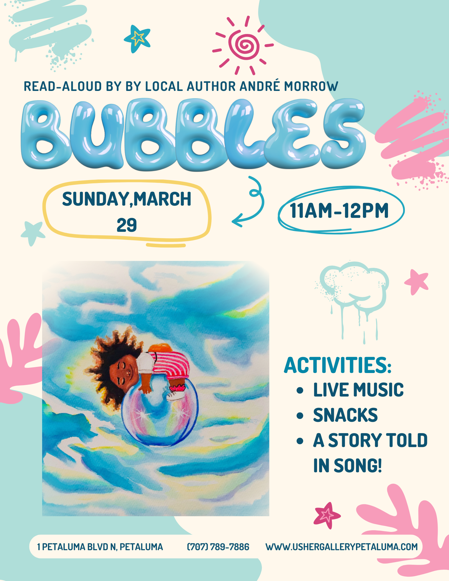 Join us on Sunday, March 29th, from 11am-12pm, for a fun children’s read-aloud of Bubbles by local author André Morrow! All are welcome to join us in reading and celebrating this musical tale. We’ll be featuring live children’s songs, snacks, and an engaging storytime. “Bubbles” is a whimsical story that teaches young readers to appreciate […]