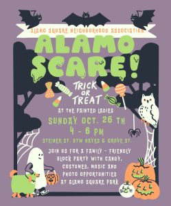 Join the Alamo Square Neighborhood Association’s family-friendly block party tradition, Alamo Scare! There will be candy, costumes, music, and photo opportunities at Alamo Square Park. Street will be closed on Sunday, 10/26, for trick-or-treating the Painted Ladies on Steiner Street between Hayes and Grove from 4-6 PM. Music and procession led by the Prescott Circus begin at 4 PM!