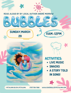 Join us on Sunday, March 29th, from 11am-12pm, for a fun children’s read-aloud of Bubbles by local author André Morrow! All are welcome to join us in reading and celebrating this musical tale. We’ll be featuring live children’s songs, snacks, and an engaging storytime. “Bubbles” is a whimsical story that teaches young readers to appreciate all the wonderful little things in life, like playing with pets and family, blowing bubbles, and enjoying the outdoors. The story highlights gratitude in a playful and educational way!