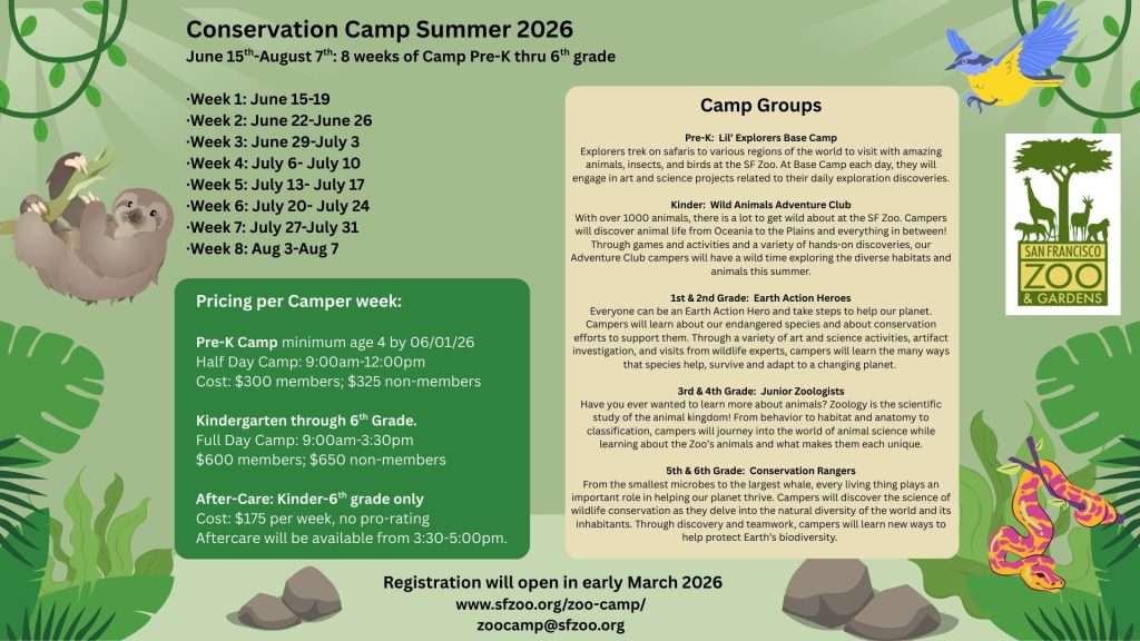 Join us for our Conservation Camp with week-long Camps (Monday-Friday) with a focus on conservation, animal activism, and hands-on art and science. Camp families can sign up for 1 or 2 weeks of animal/habitat exploration and wildlife fun with the team at SF Zoo and Gardens!